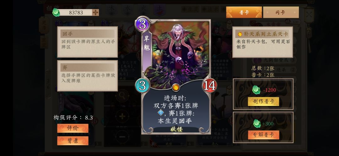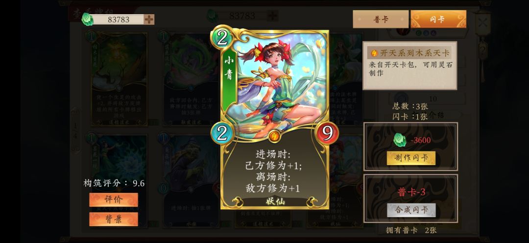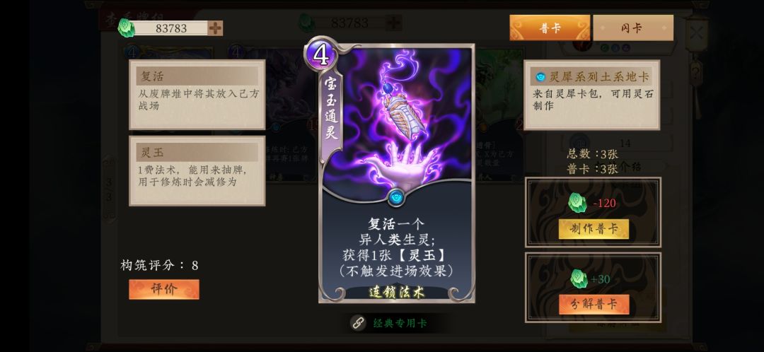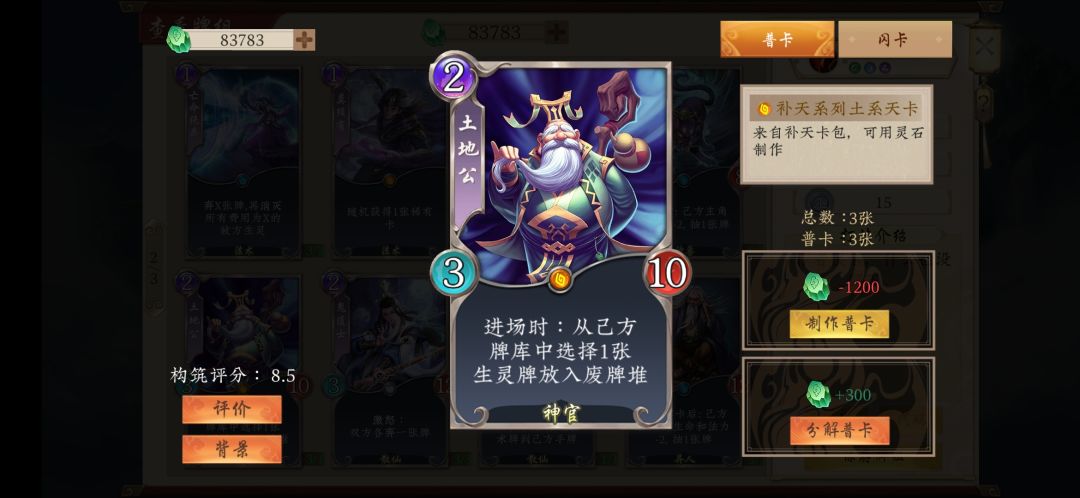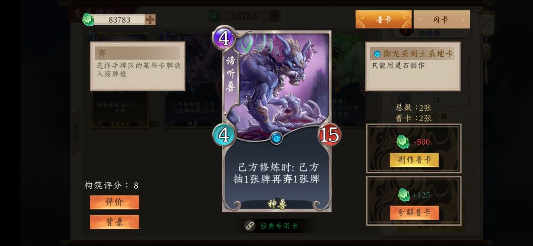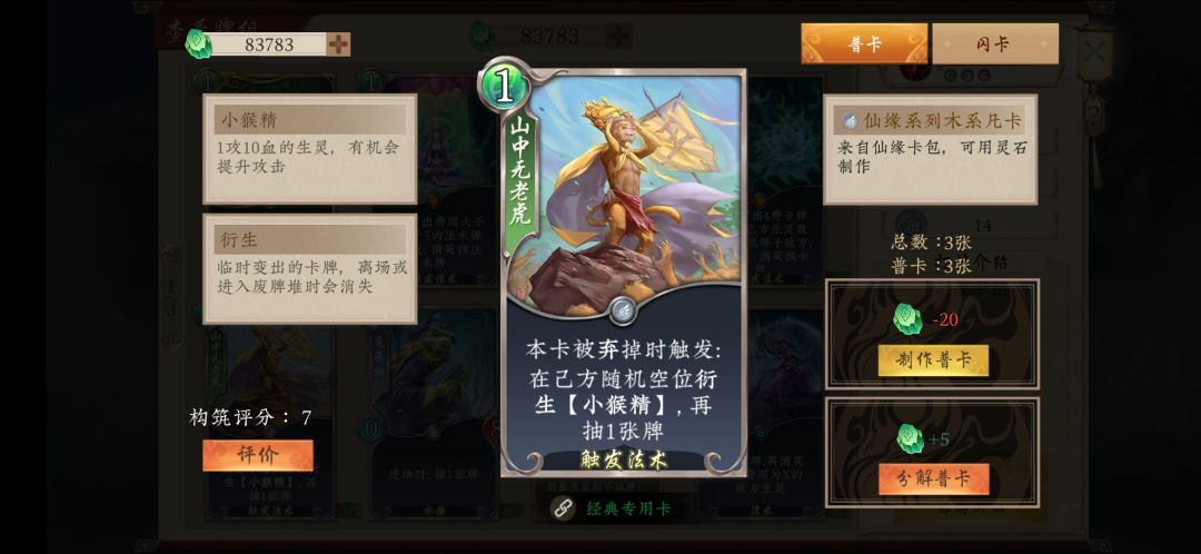 8.谛听兽,稳定的过牌和弃牌源。每回合修炼时可抓一弃一,能够高效的过牌。同时可以将手牌中的青帝和山中无老虎扔进坟场。