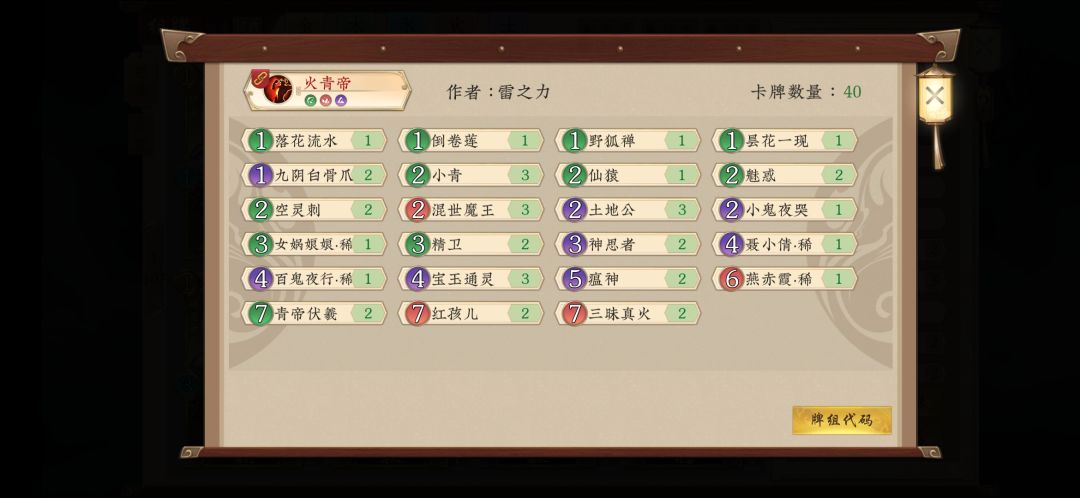 青帝类套牌使用的高手非常多,每个人对单卡的取舍都有着自己独到的理解,所以笔者这里放出的牌表也仅供读者们参考。大家可以根据自己的习惯,和对环境的分析自行调配。同时,由于笔者只有一张女娲和燕赤霞,故牌表肯定不是最佳,大家可自行补足女娲到三张。