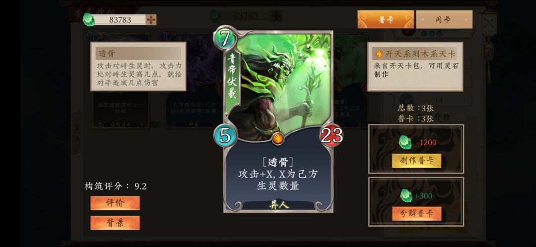 9.青帝伏羲,核心单卡,是套牌的名称由来。一切的掘坟体系都是围绕着其来展开的,同时也是这套牌的主攻生灵。其优势在于,在场上达到僵持状态时,即双方都铺满六个生灵后,其透骨能力使得你仍可以持续对对手造成高额伤害,使得场面虽然看似势均力敌,但实际的效果却是你占据了绝对优势。