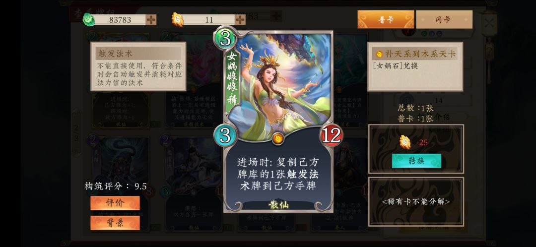 2.女娲娘娘和山中无老虎的体系,此体系通过女娲娘娘的进场异能复制牌库中的触发法术山中无老虎,再通过各种弃牌手段去触发后者,使得在战场的同时还能实现有效过牌,可以说是现在中速套路中最稳定和高效的一套体系。同时,女娲可以根据场上局势,选择其他几种触发法术进行有针对性的防御,或保护己方场面巩固优势,或破坏对手扩张节奏挽救败局。可以说女娲就像比赛的节拍器一样,像足球场上的中场大师,控制着对局的节奏。
