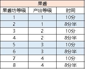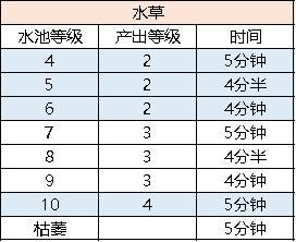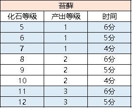 内含苔藓,水草,果酱,木材,蘑菇,火堆,花的生产时间(部分是根据前面等级推算的)
