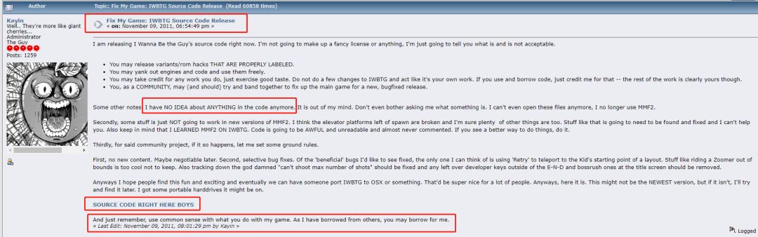 该产品类型起源于美国独立开发者kayin的《IWBTG》,该作者kayin也明确表示过该游戏是开源的,愿意共享,我们也是看到他的开源信息后,并且对IWBTG玩法类游戏非常感兴趣才决定做的《全民iwanna》,下图是kayin的开源公告。
