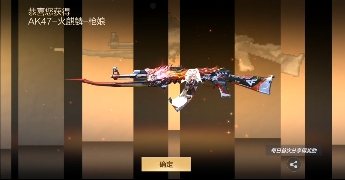 这款皮肤的由来和上一把是一样的,同样是国漫《枪娘!FIRE》主角同名专属AK47-火麒麟-枪娘,拥有灵动的漫画主角光环,这把武器的展示效果可以说超级酷炫。