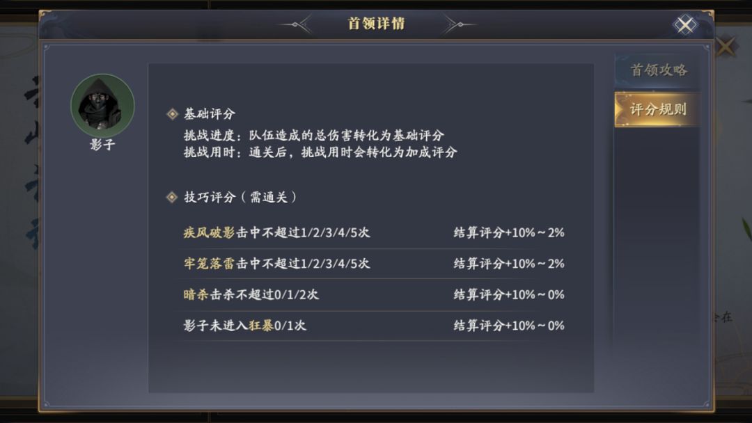 有兴趣冲排名的小伙伴可以看一下通关的技巧评分,评分会影响最终的排名成绩,但不影响我们拿奖励。只要通关本周的BOSS影子,保底可以拿到10000分,所以技巧评分对咱们来说,意义不是很大,这里便不再过多赘述。
