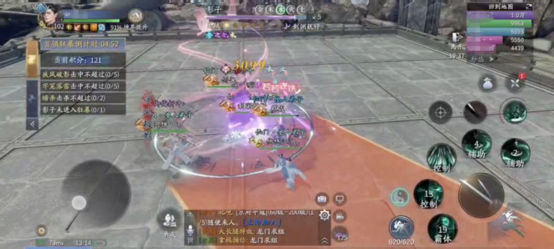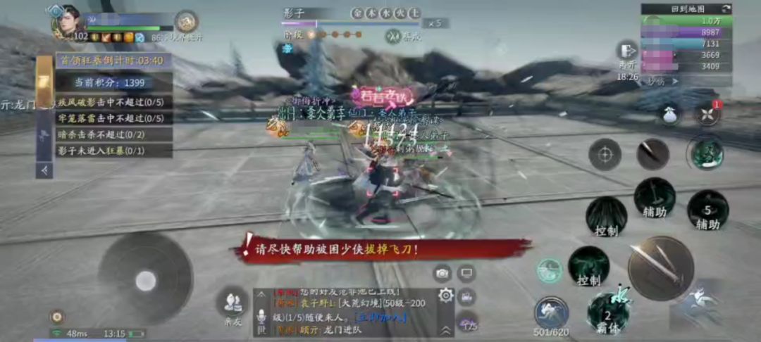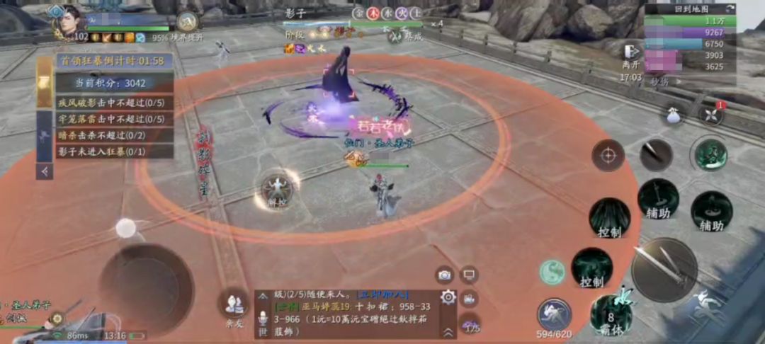 过了前2个阶段,来到第3阶段可以集体打坐把血回满。该阶段除了上述的4个技能外,还会触发一个新技能【影缚】,这个技能会将两名玩家定身并且以黑线相连,并且此时的场上会出现一个巨型飞镖并点名一位“幸运玩家”,这名玩家引导飞镖把黑线斩断即可。机制并不复杂,关键是别把飞镖往人群里带就行。