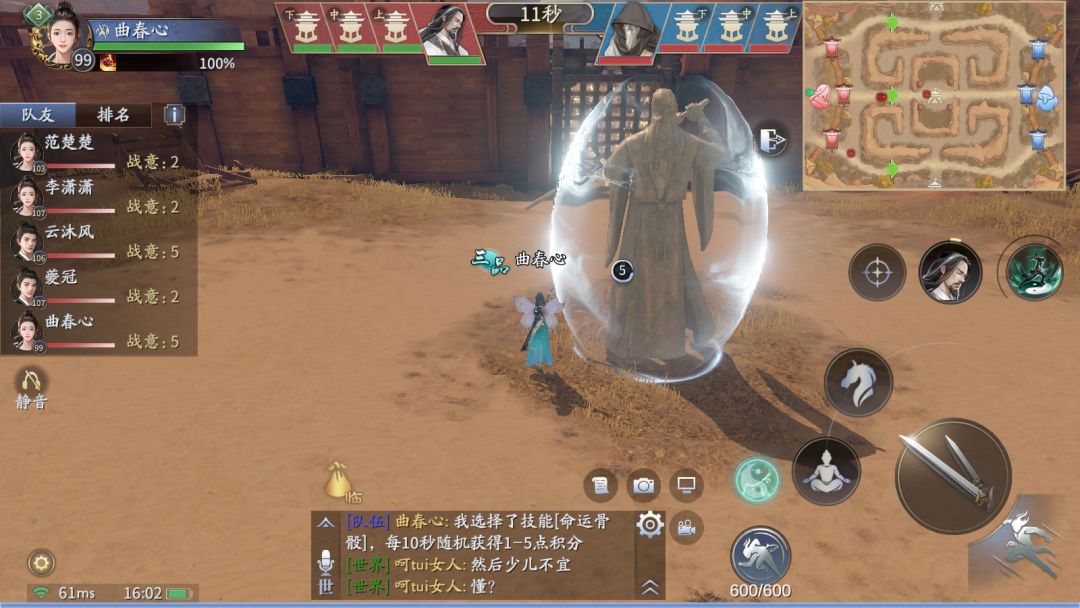 匹配成功后,玩家将随机被分配到一方阵营,并随到一位宗师(四顾剑、苦荷、叶流云、庆帝)在本次对战中助战。不同阵营将随机到不同的宗师。击败对方宗师雕像的一方将获取比赛胜利。在击败宗师雕像前,必须攻克任意一个城门,否则将没有办法进入至敌对区域。