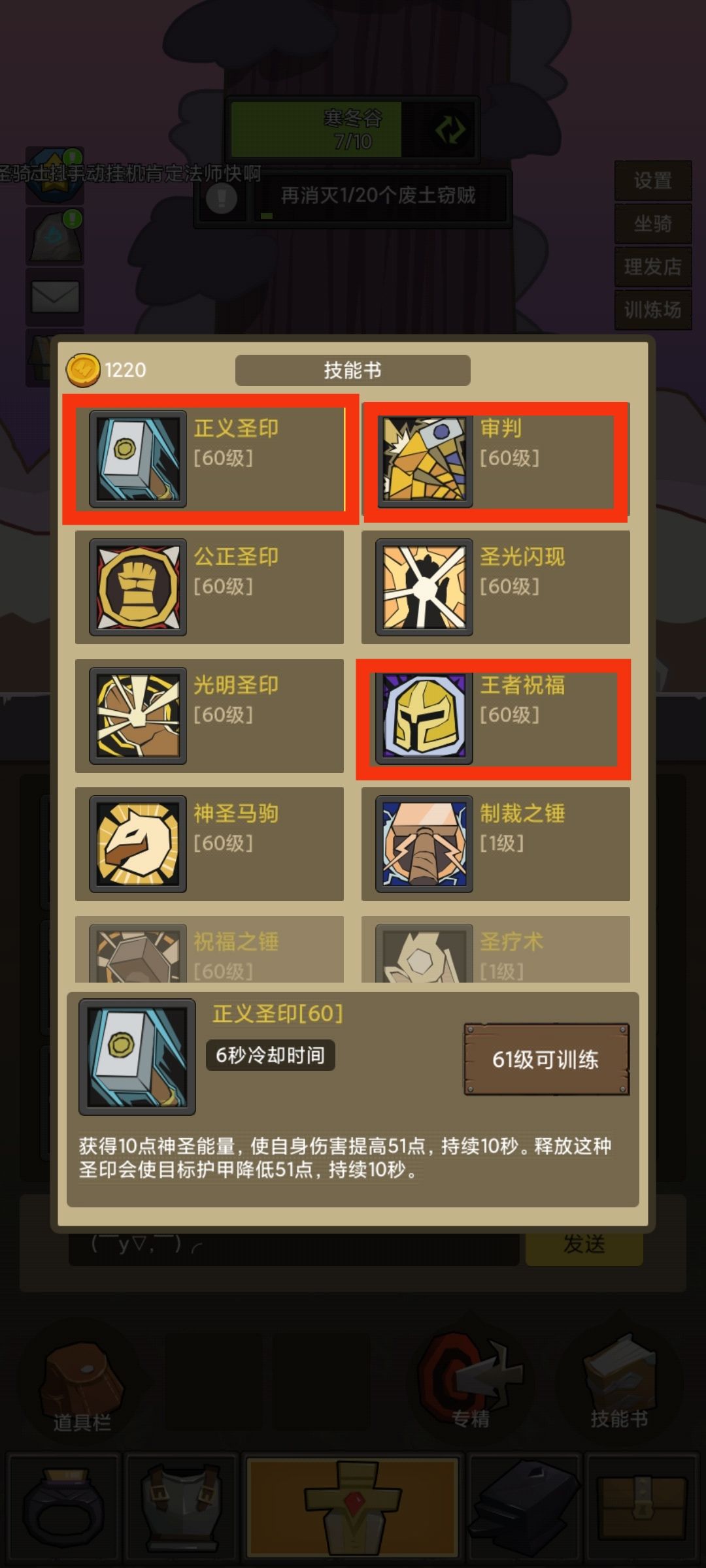 输出顺序!王者>审判>正义>审判>公正>审判>光明>审判;然后圣印审判循环。抽空补血或使用无敌,瞬回技能。