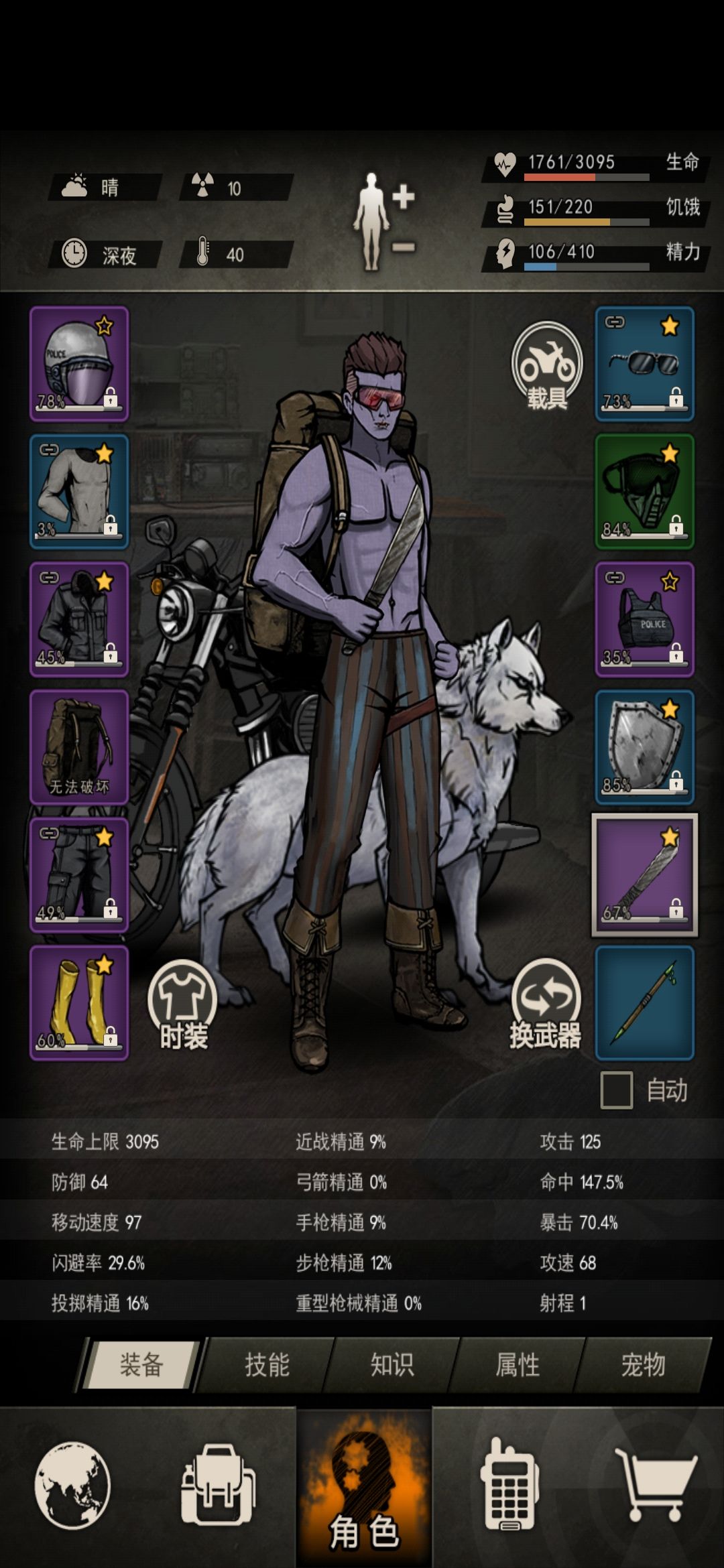经过我2.5个R药的全套,一个R吃2套料理,重氪了个完美合金盾!3下精良甲,1下精良头的神级猛男之力,猛男3095血/63防/125开/70爆击50抗爆,翻5套料理,可算把猎杀过了,跟着趁着无知者的勇气险过鬣狗,解开了和鬣狗的神秘面纱,过了是真的香,下面附属性图一张