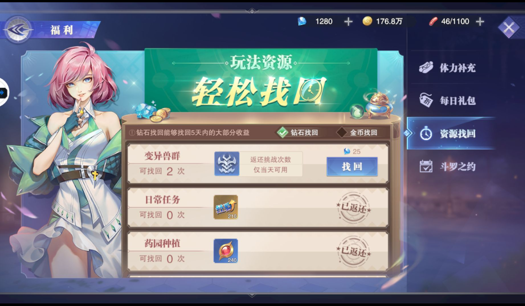 3. 可以看到,我们最高找回前五天的收益,所以我们可以将体力、资源攒满五天,然后统一找回再使用双倍卡。