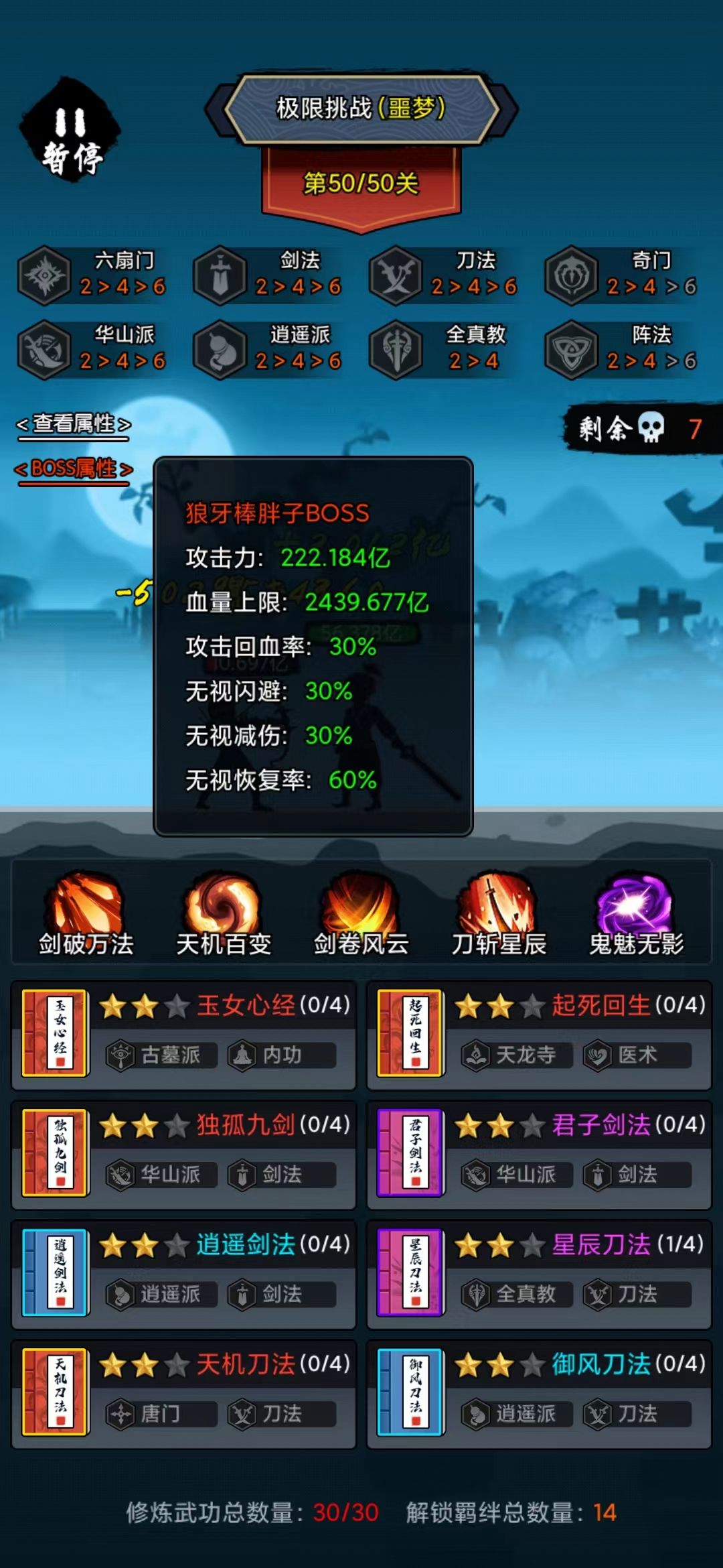 极限挑战(地狱)难度,关底BOSS属性和38章差不多,玩家过不去,难点就在于拿不到想要的功法,下面就爆杀流和刮痧流详细说明一下。