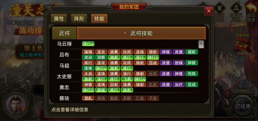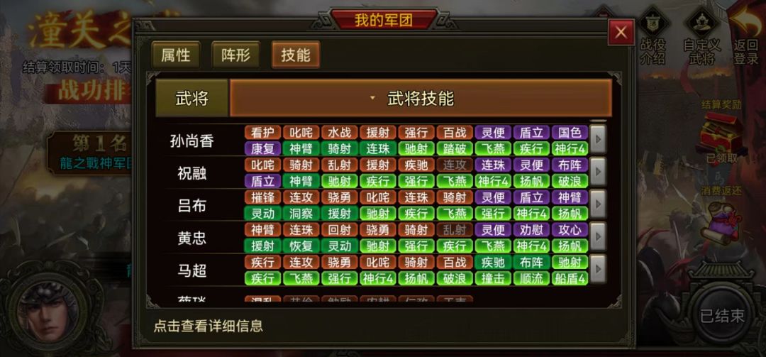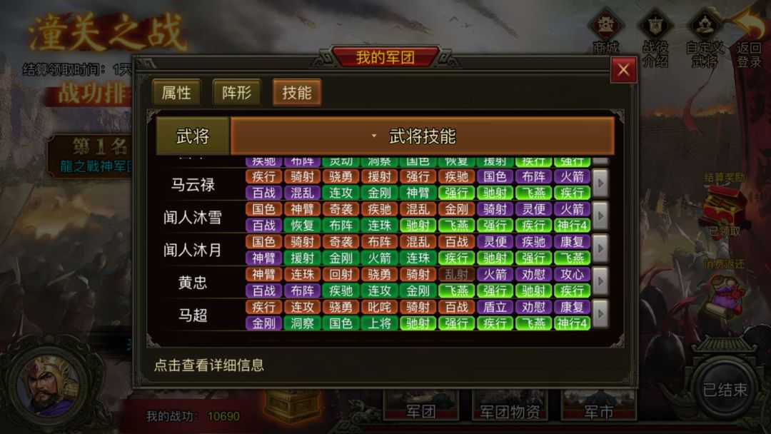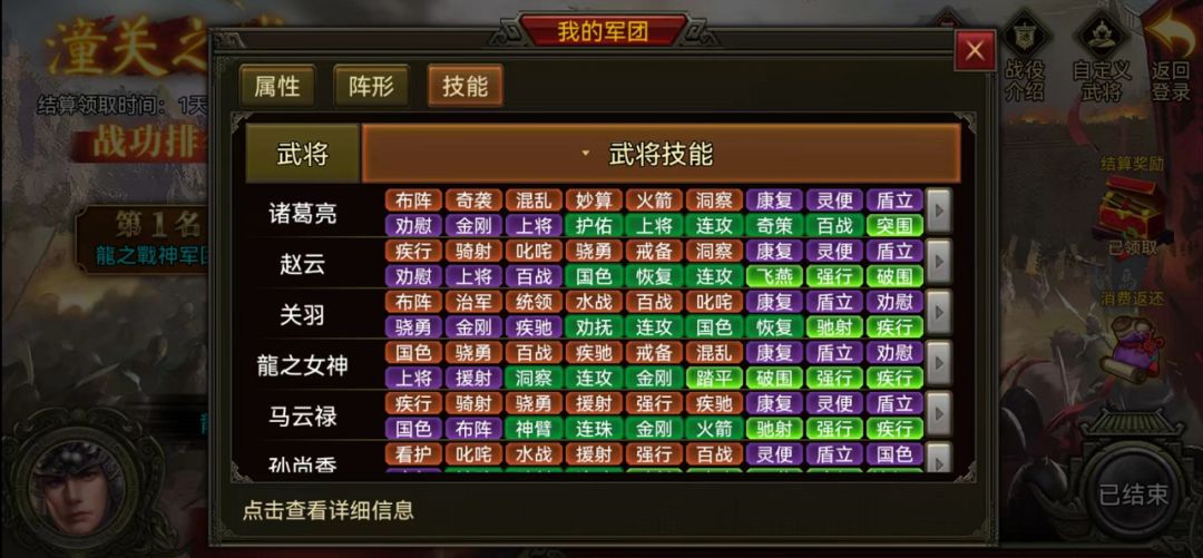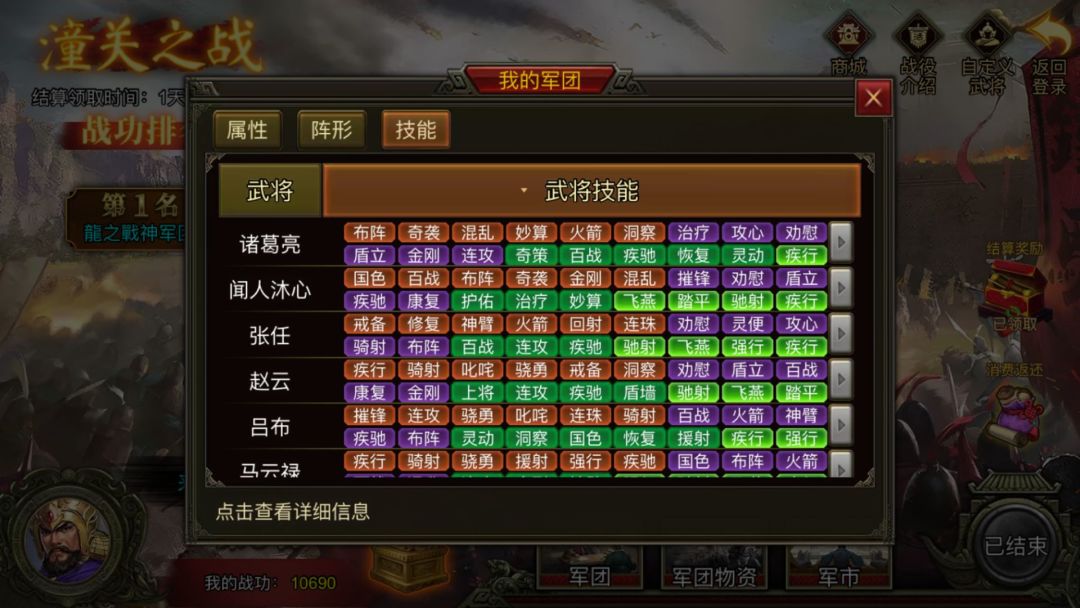 首先是龍之戰神军团。龍之戰神军团武将的配置是马超、诸葛亮、赵云、关羽、马云禄、孙尚香、祝融、吕布、黄忠+1个自建。以下是他的武将技能配置详细:
