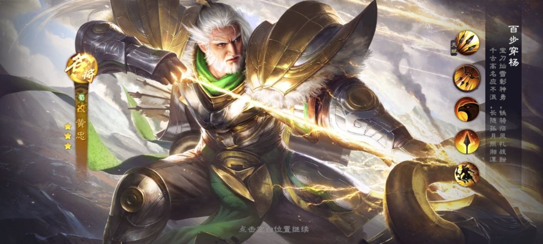 【百步穿杨】使黄忠释放主动技能时,增加多层齐射,并且每层齐射能够提升黄忠的攻击速度。搭配天赋技能使用,既有输出又加攻速,大大提高了黄忠持续作战能力。