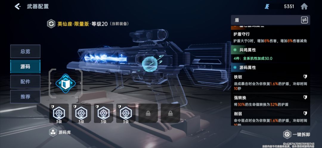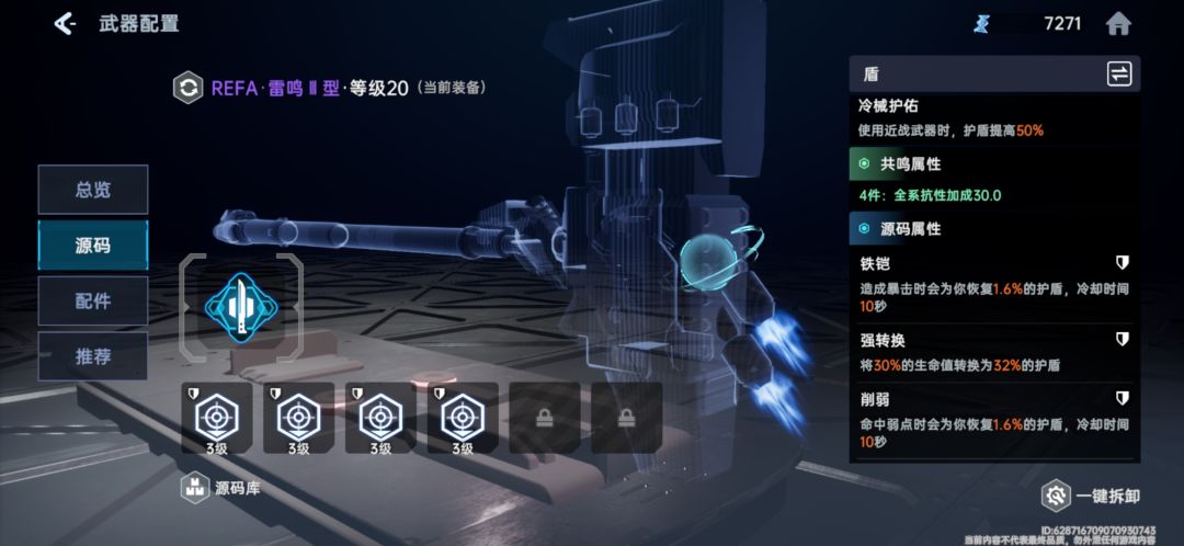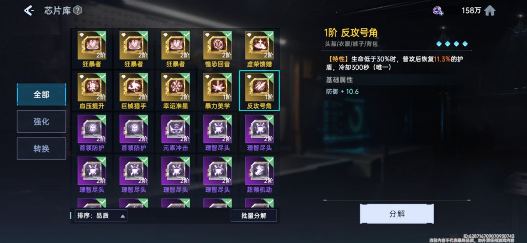 身上的芯片至少要有这两个,惶恐是回血主力,号角是以防万一。其他位置建议全带防御,特性无所谓,因为装金不太现实,而且强转换是用百分比血量和百分比盾转换,和自身血量没有关联,这一套可以放心词条刷盾然后把生命芯片换成护盾和防御,不但提高坦度,盾量回复搭配杏仁茶