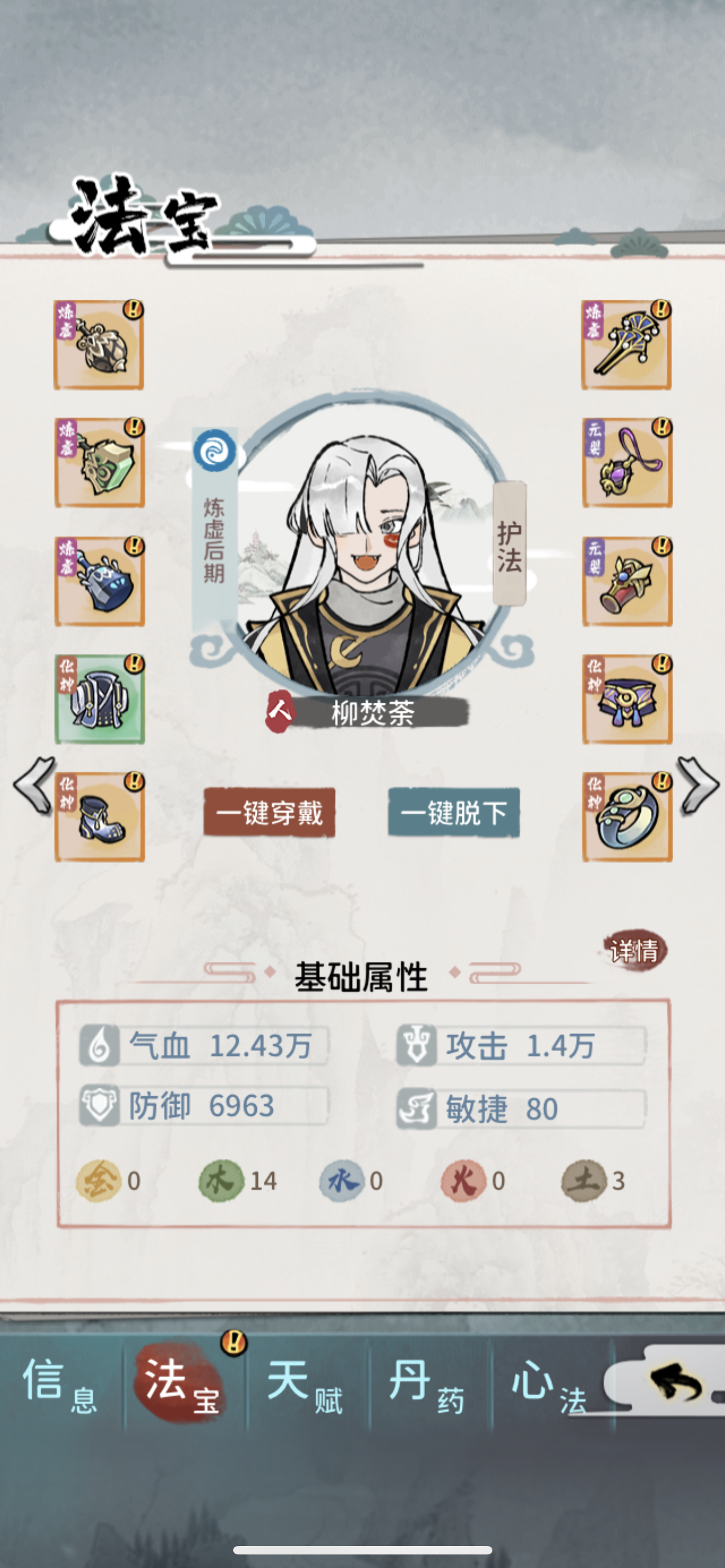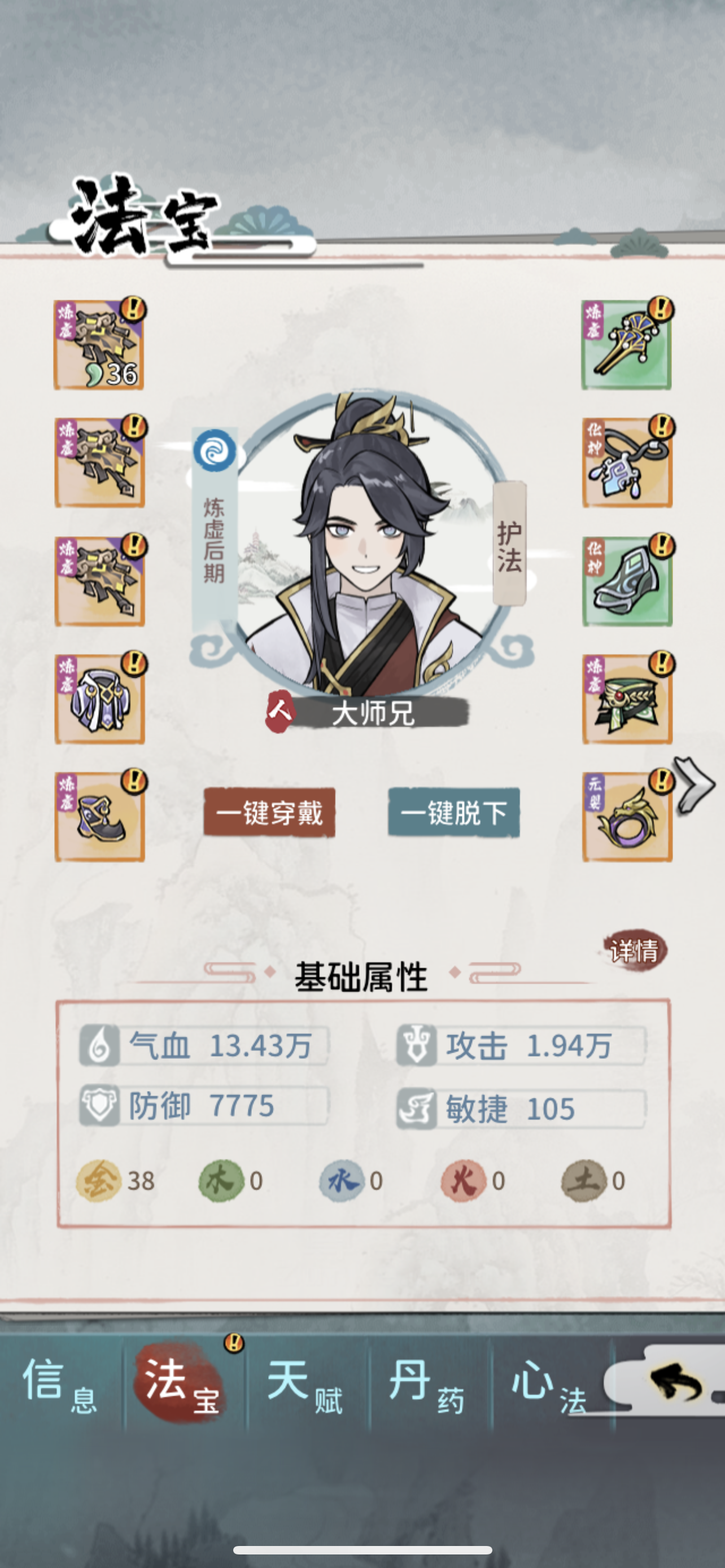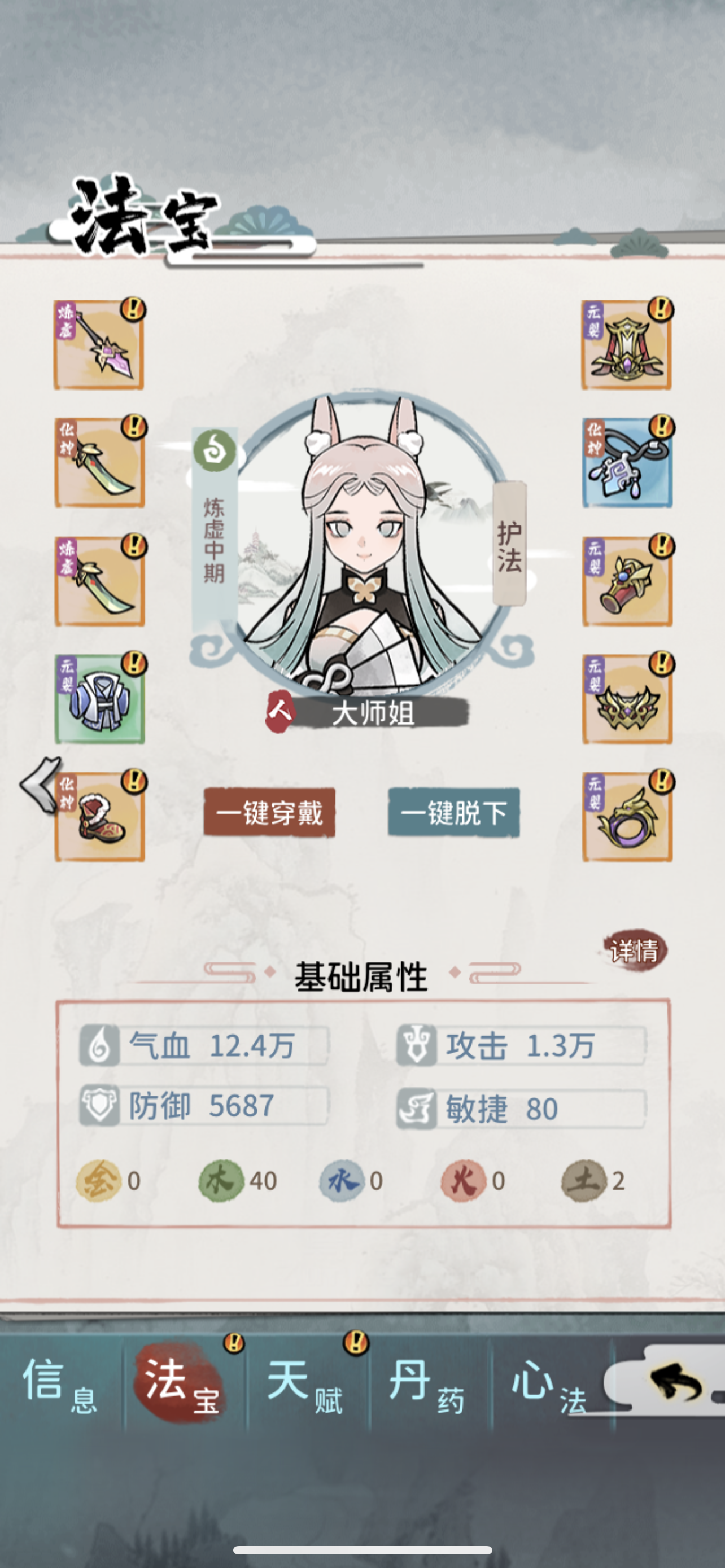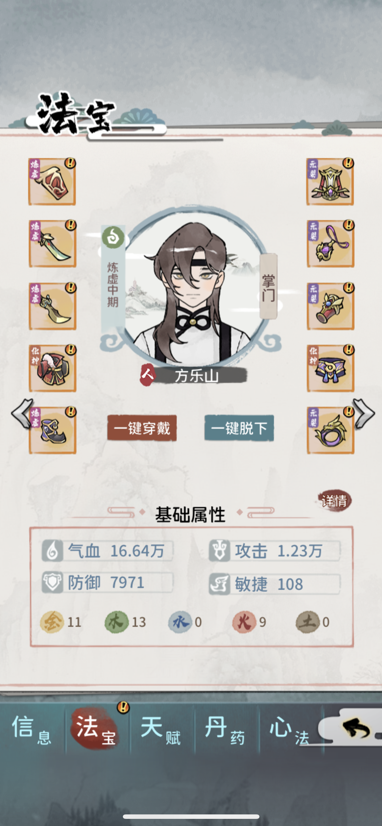 主T为掌门,带全体免伤,输出全靠邪修带金幡,小师妹给水锤活得久,大师姐和另外个打手是木属性,给啥都比较鸡肋,随便哪个一号位上土枪可以破防,这俩人物叠木属性我发现被boss一拳就打死,毕竟金克木不好打。就剩下几个boss没打了,有点难过,主要是靠金幡和免伤盾外加个土枪破防,防具类装备能上免伤和闪避尽量给。