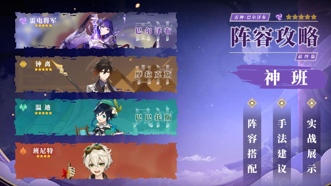 旅行者们,大家好吖!这里是O丶Ha丶Yo。雷神的阵容搭配攻略系列的【雷国】、【雷九】、【优雷】和【雷达】已发,本次带来了【神班】的阵容搭配攻略。