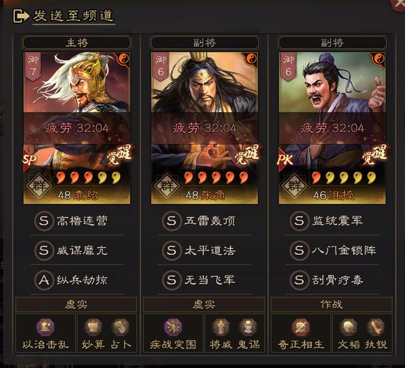 (这里就是把传统的SP朱儁的“无当飞军+焰逐飞风”换成了输出上限更高的张角,降低了一些控制,可强度感觉反而更高了,毕竟焰逐飞风虽然有上限,可是也是比较看脸的!)