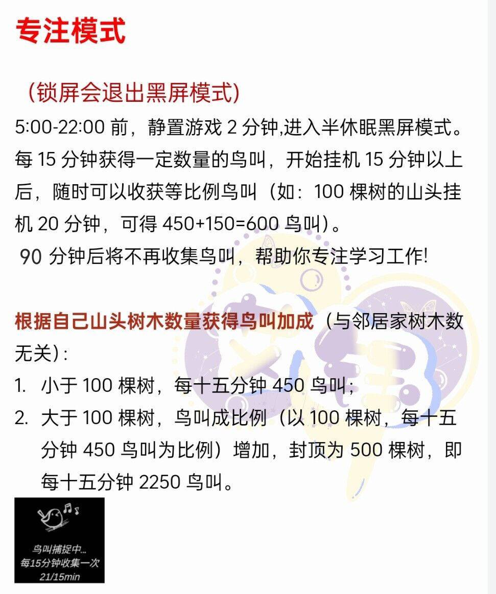 ③挂机。在鸟叫还没到达上限的前提下,可以通过专注模式挂机直接突破上限。挂机无论是获得200~1000都可以加上,且如果是在邻居家挂机突破了上限,回家以后依然可以获得邻居的感谢。