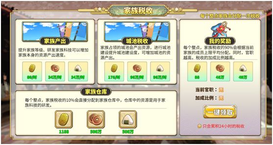 2.家族税收:根据家族科技的提升,跟家族所占领的城池多与少,每24小时可获取一些兵粮跟铜钱(官职越高,税收的奖励也会提高)