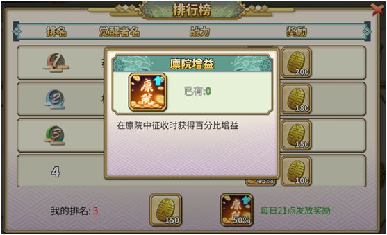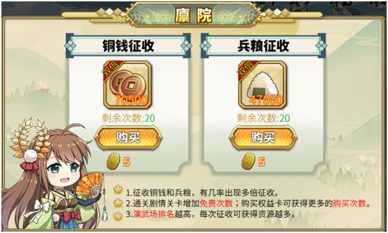 五.廪院:每日可通过免费跟叛金获取对应的兵粮跟铜钱(演武排名越高,廪院获取的兵粮就越高)