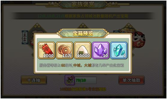 3.家族褒赏:抽奖会抽到一定的兵粮跟铜钱(占领城池越多,产出令牌越多)