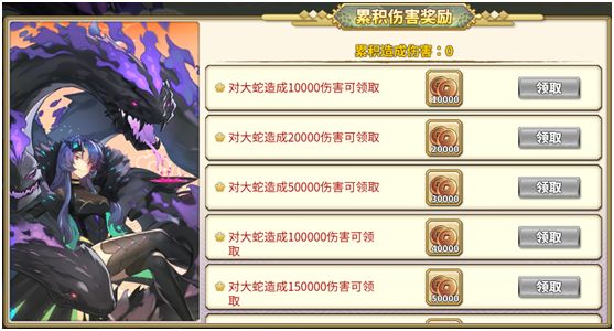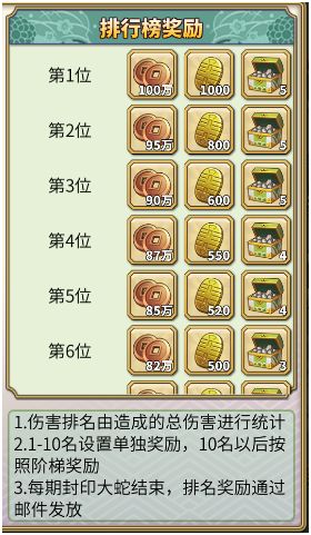 八.征讨—大蛇封印:参与玩法大蛇封印,打到一定的伤害即可领取对应的铜钱奖励,玩法结束后排名越高的就能获取很多的铜钱