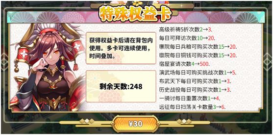 1.特殊权益卡:购买特殊权益卡后,廪院可购买兵粮、铜钱的次数也会增加,历史战役的购买次数也会增加(历史战役次数增加意味着自己可多获取一些兵粮跟铜钱)