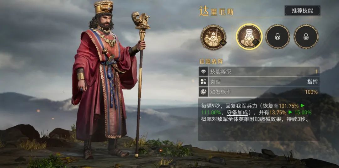 固有技能大帝权威可利用队友的固有指挥、追击技能叠加印记,满6层即可释放一次,伤害率高达恐怖的600%,且同时还能增加全队20%的伤害持续9秒。