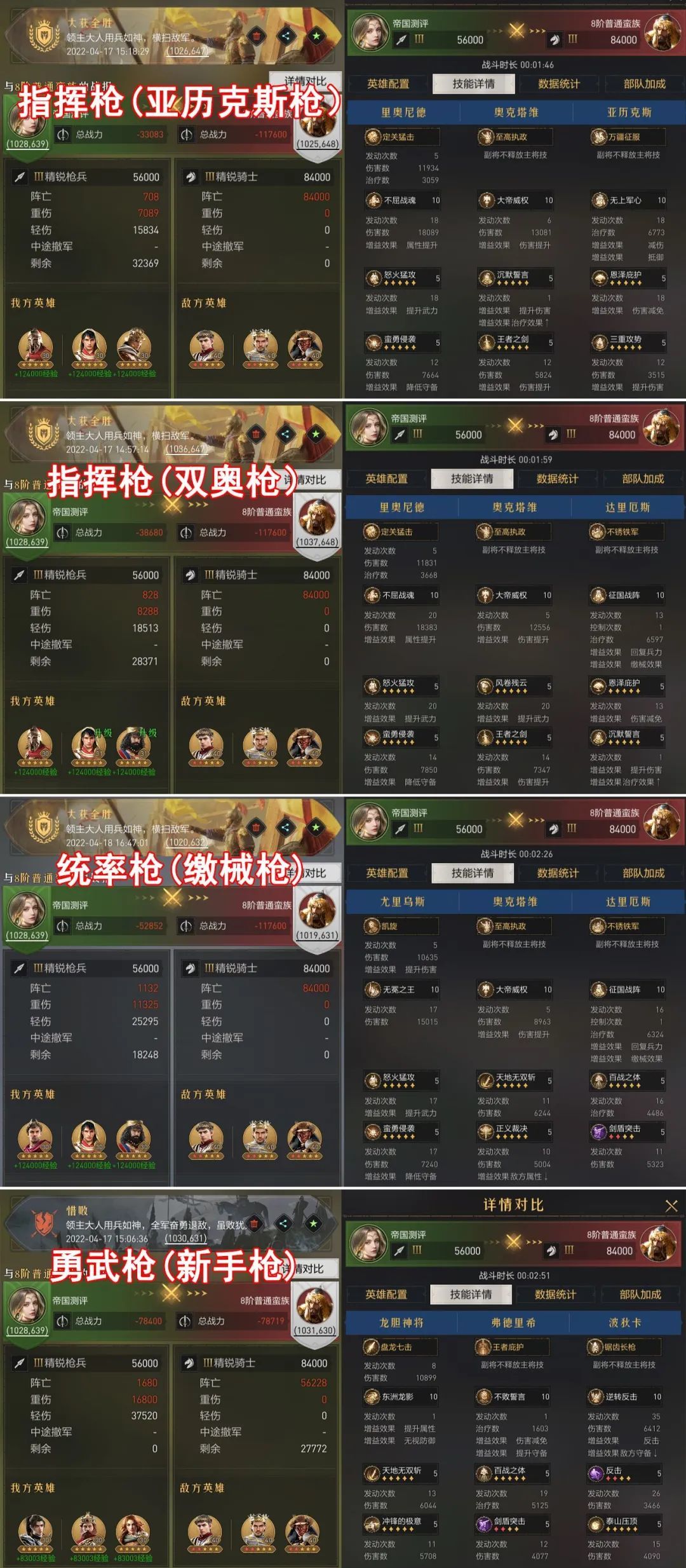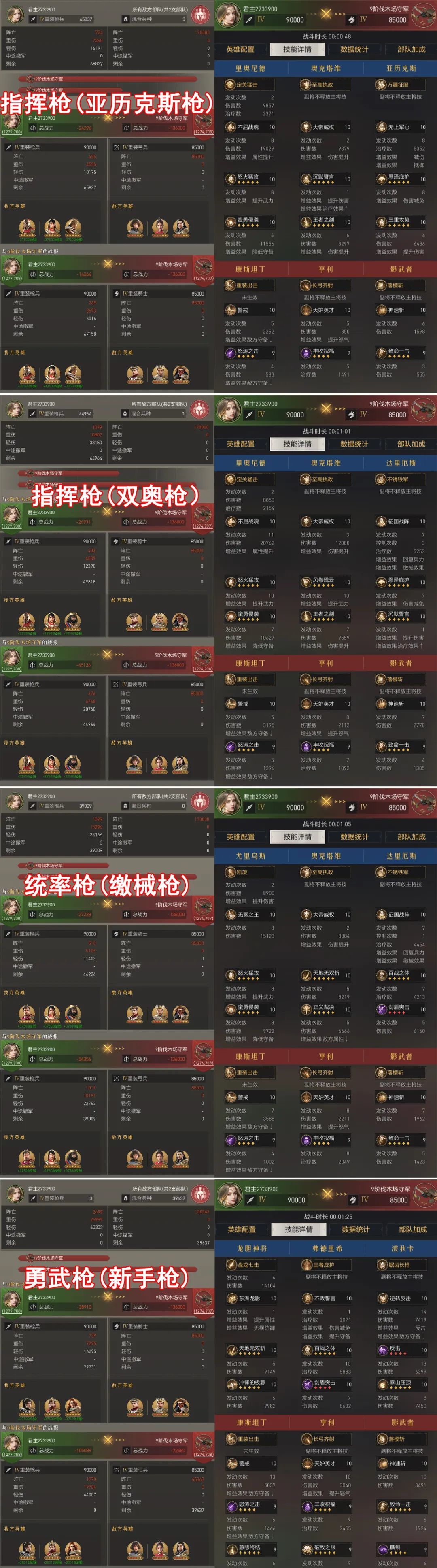 战报解读:以KD数值(击杀÷阵亡重伤轻伤总和,越高越好)来直观展现,在同样击杀84000的情况下,亚历克斯枪伤亡2.4w,KD比3.55;双奥枪伤亡2.8w,KD比3.04,略低于指挥枪;缴械枪伤亡3.8万,KD比2.23;新手枪没能完成测试,KD比1.00。245级阵容 VS 9级资源田