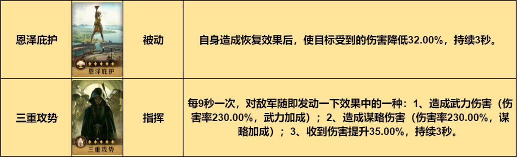 四星:列阵御敌可用于替代任意输出指挥技能,钢铁之躯或不屈战意可替代恩泽庇护。