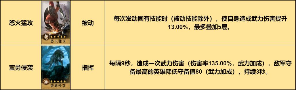 在技能选择上,为放大不屈战魂和定关猛击的输出效果,可装配怒火猛攻,另一个技能可选择伤害率较高的指挥技能蛮勇侵袭,进一步放大怒火猛攻的收益。