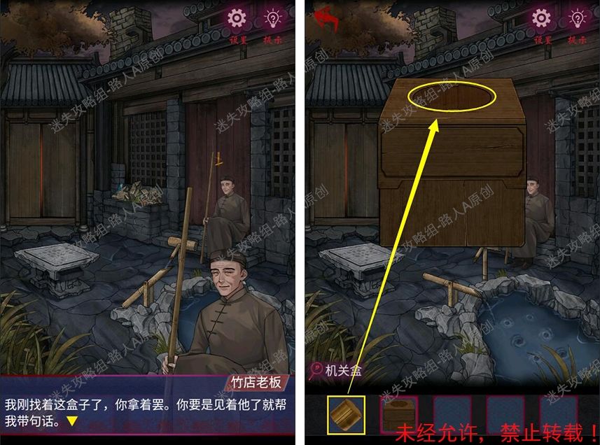 108.和竹店老板对话,得到【机关盒】。用【铜柱】打开机关盒,得到【泥人】和【钥匙】。108.1