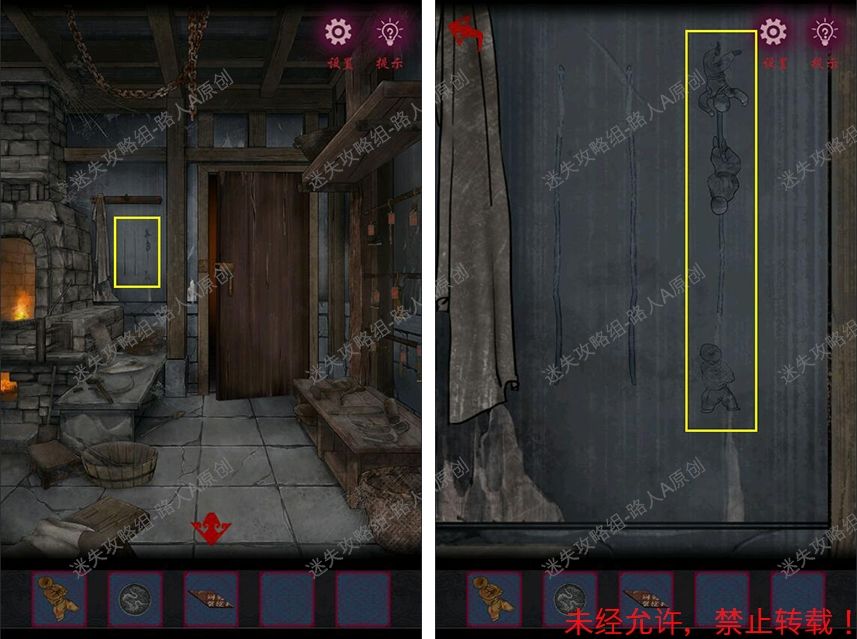 110.将【泥人】放入机关,根据墙壁的图案线索,调整泥人位置,得到【正方形木块】和【铃铛】。110.1、110.2