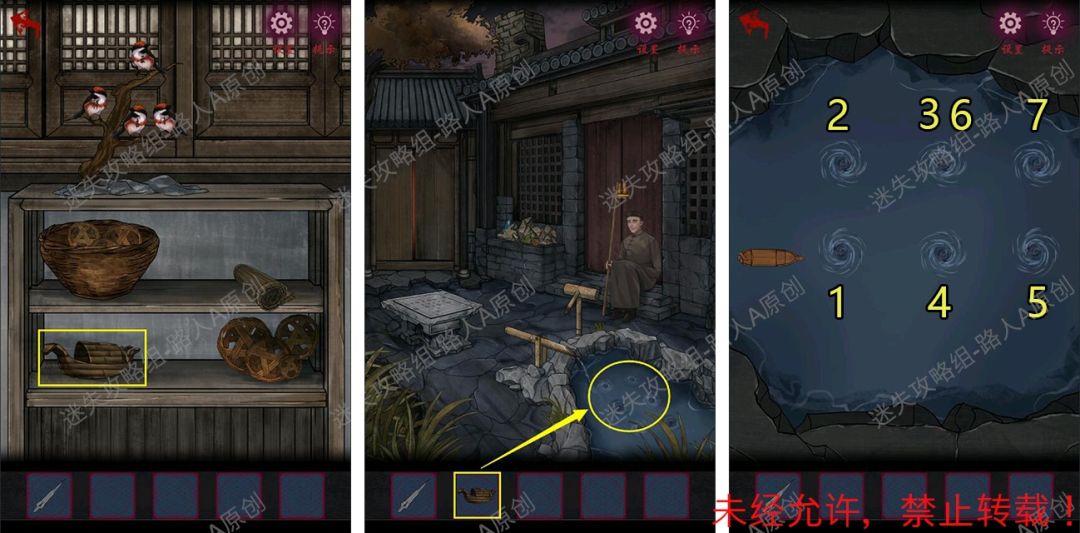 92.根据鸟啄石头的顺序和次数,依次点击鸟:祥2次、云3次、吉2次、门1次,得到【水浮针】。92.1、92.2