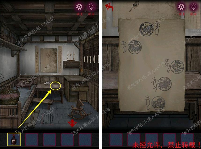 115.掀开地毯,将【鼠纹滑块】和【龙纹滑块】放入机关,根据窗户和信纸的线索,调整滑块位置,打开地板暗格,查看照片和纸条。115.1、115.2