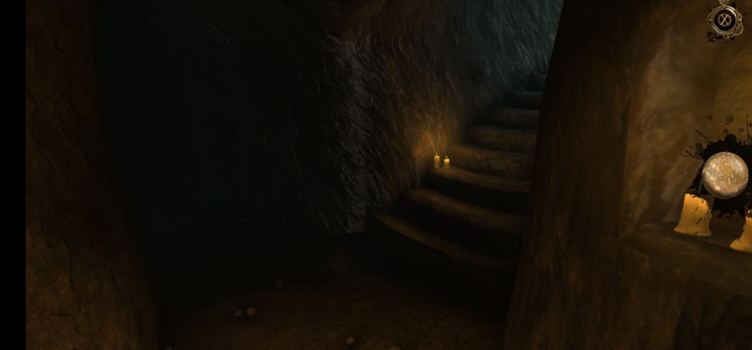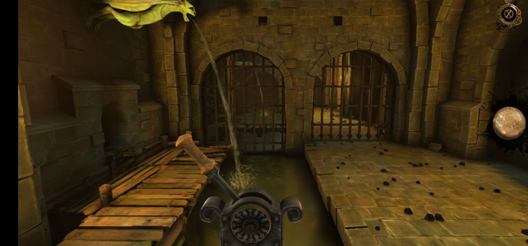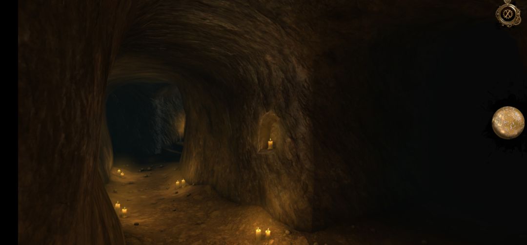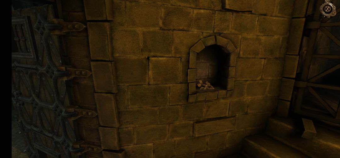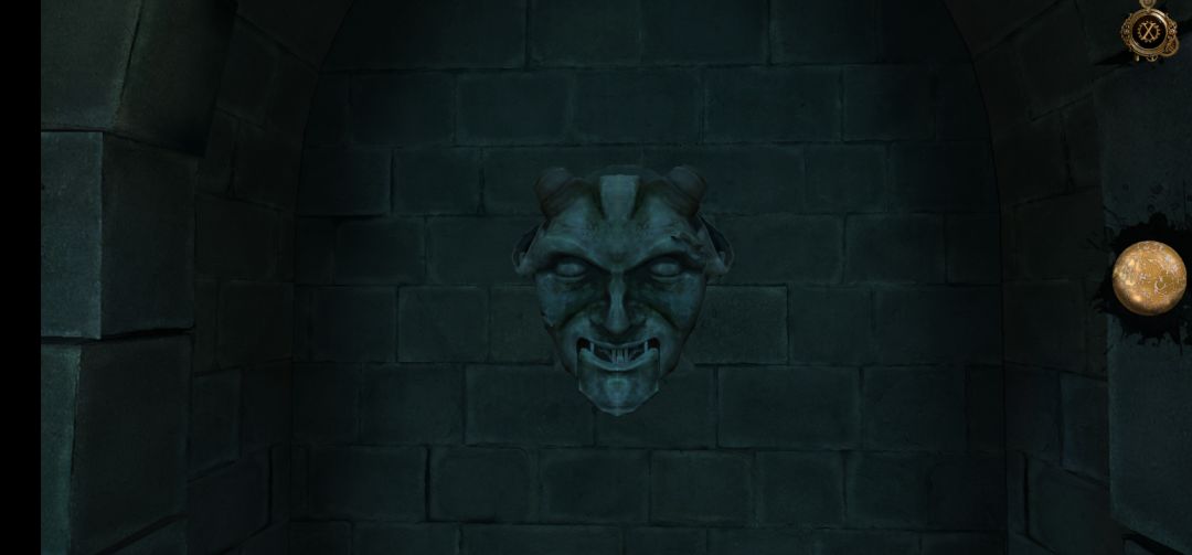 回到此处,将石首放入画面左侧墙壁的凹槽中,再向下拖拽石首的下巴,打开石门
