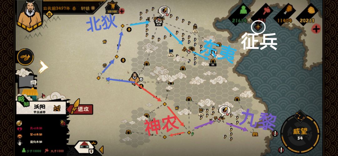 ★重点★随后开始往上方北狄和下方神农同时进行探索 推进 沿着下面图片的路线探索和消灭这两个势力