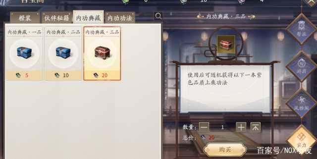 分为红色、金色、紫色、蓝色、绿色。 活动和升级过程中可获得基础内功。可通过分解绿、蓝、紫内功书获得蓝色、紫色、金色内功碎片,再进行内功随机合成。