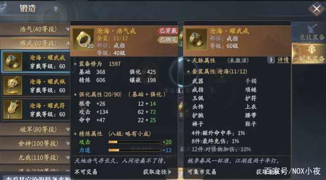 装备分为红装(玩家自己打造)、橙装(部分副本掉落、部分通过帮贡锻造、部分通过周本材料兑换)、紫装和蓝装。红装和橙装均有套装属性。