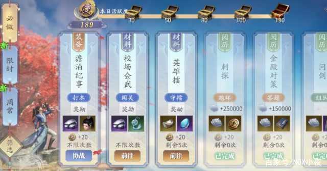 2) 活动每日必做儋泊纪事、刺探、金殿对策、问剑、情报簿、海捕令等(根据等级逐渐开放新的必做任务)