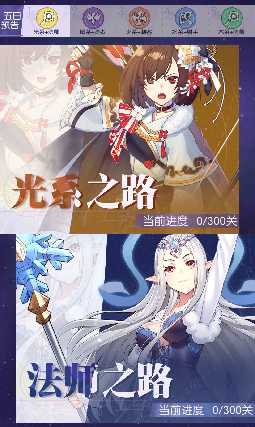 五种属性五个职业共有10路,每路300层,推荐输出为达芙妮出战+莫伊拉底座,其他角色按要求搭配