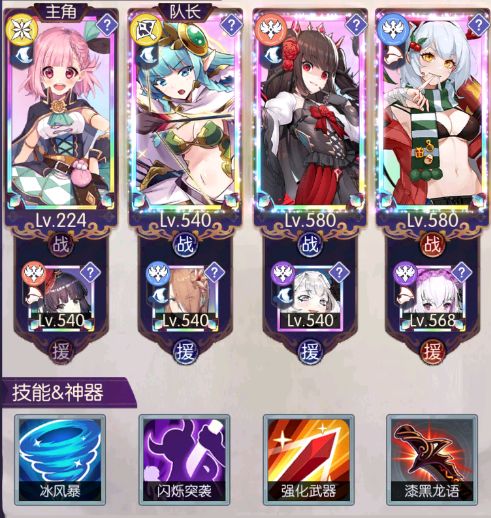 其中,暴风雪和强化武器都可以触发达芙妮的二技能,使输出最大化,强化武器无等级要求;队长位放克制属性的英雄