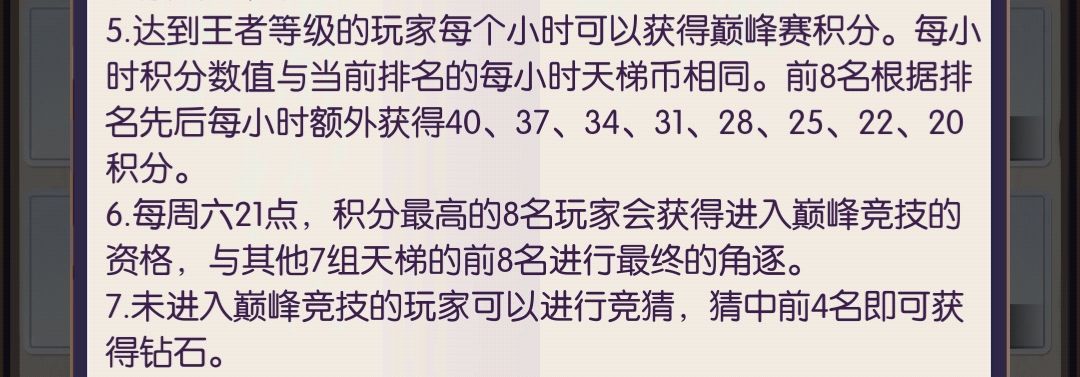 ●竞猜:巅峰赛开始后,未达到积分前八的选手,可以竞猜四强,其中冠军给1000钻,亚军给600钻,四强给400钻,一共2400钻