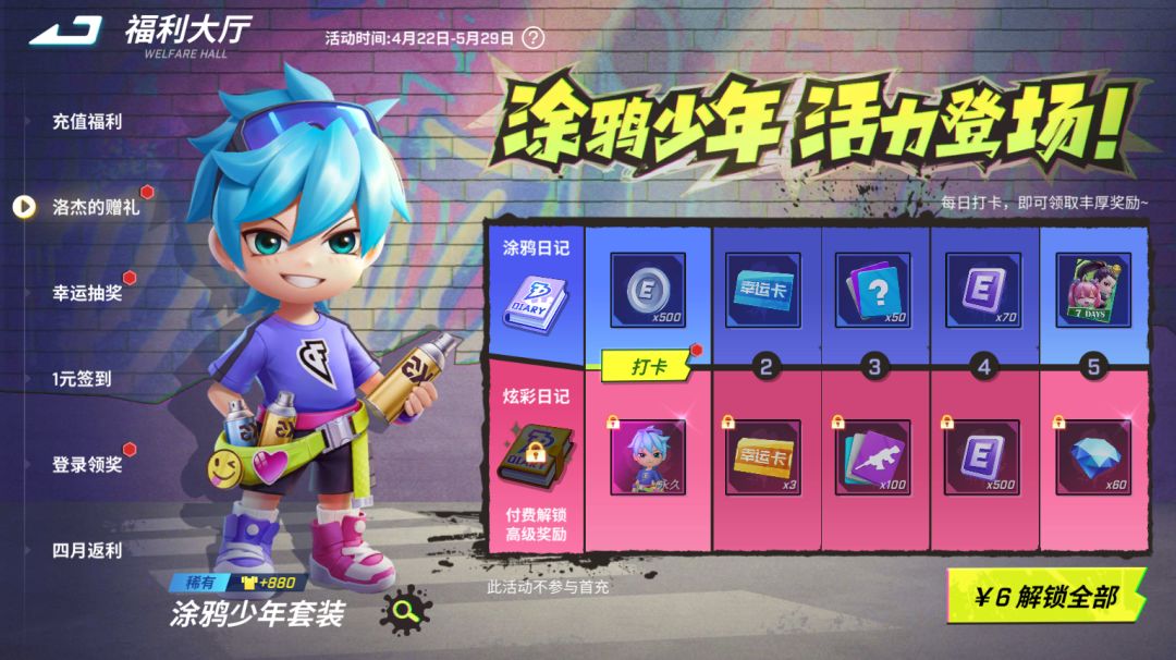 解锁后首日即得失忆者·涂鸦少年套装,第5天可以领取60钻石哦~
