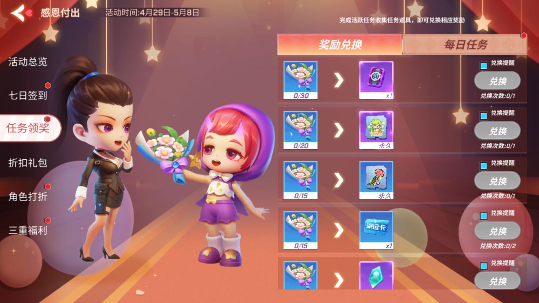 积累一定数量的【感恩花束】可以兑换限定涂鸦、角色碎片和卡包等奖励!