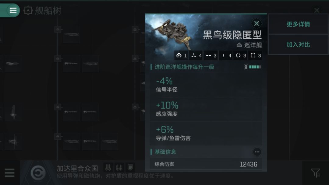 T7的隐匿型巡洋舰是四大族各族一艘,其中导弹船两艘,炮术船一艘,无人机船一艘。先说说两艘导弹船,一艘是加达里的黑鸟级隐匿型,虽然其船体加成的重点落在了“感应强度”这个属性上,而且对导弹的伤害加成也比较低,只有每级6%,但是其能栅输出较高,可以装更多更好的装备。