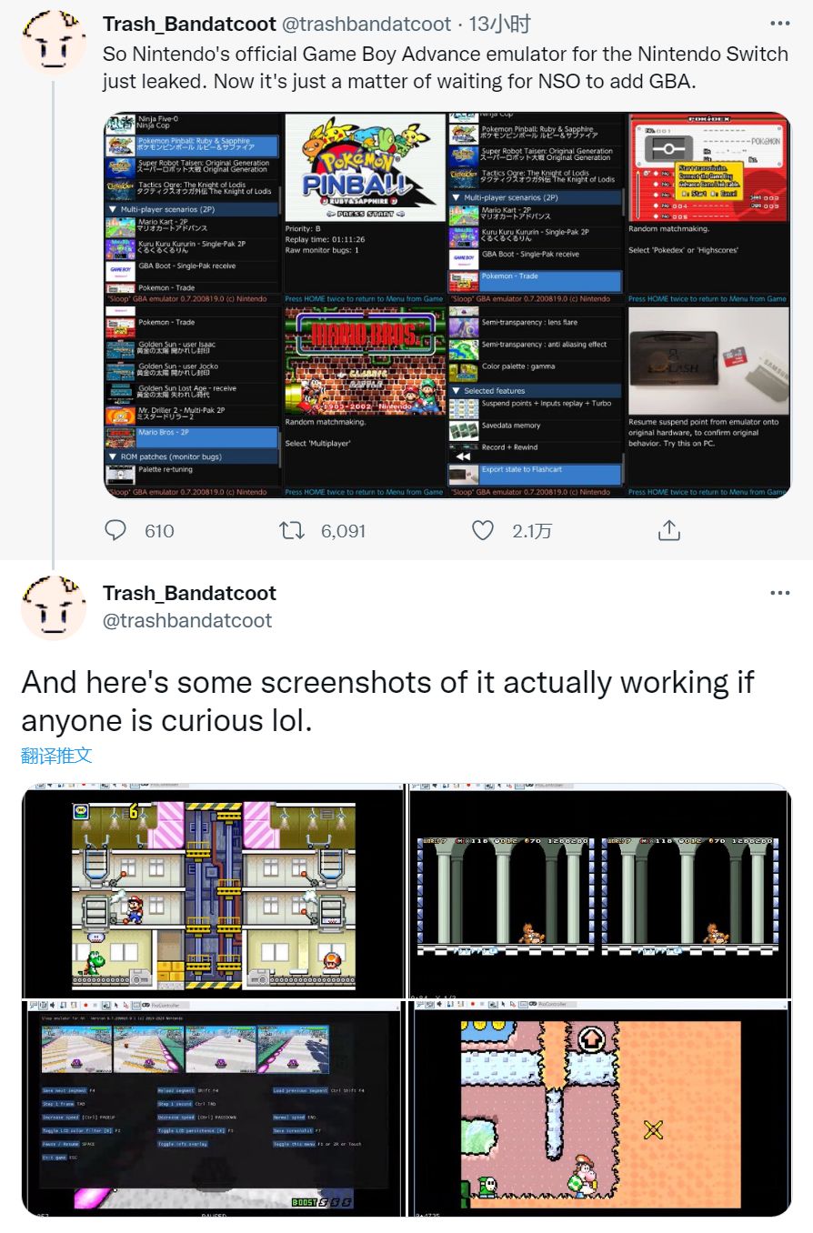 另一位已经炸号的用户 RatgorlHunter 直接发布了模拟器启动和运行的截图,专注于挖掘游戏文件的 PoryLeeks 也发布了启动视频,他游玩了《黄金的太阳》以及原版《塞尔达传说 织梦岛》,并运行了 GB 的《俄罗斯方块》。用户 MondoMega 在转推中发布了一个目前已知的 GBA 游戏模拟列表。