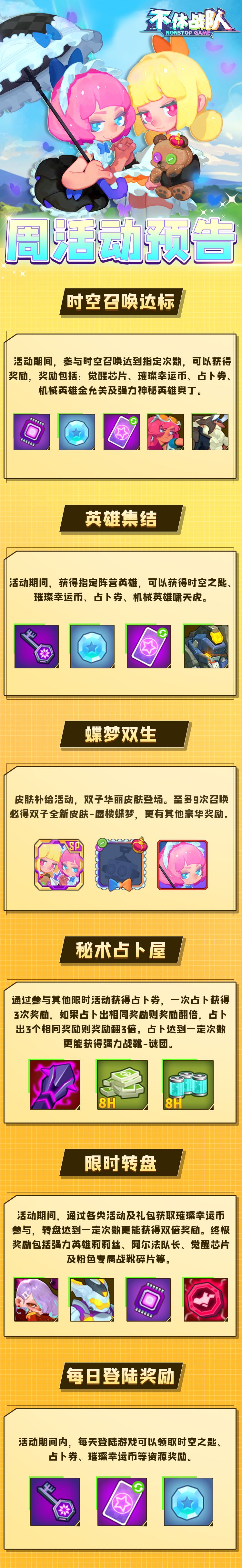 ⑤限时转盘:活动期间,通过各类活动及礼包获取璀璨幸运币参与,转盘达到一定次数更能获得双倍奖励。终极奖励包括强力英雄莉莉丝、阿尔法队长、觉醒芯片及粉色专属战靴碎片等。
