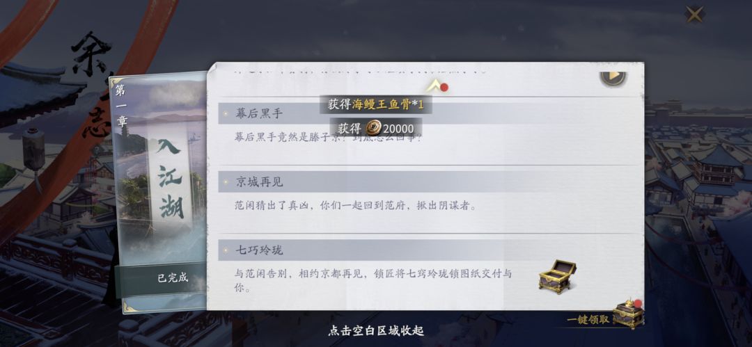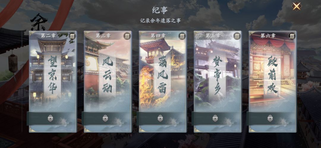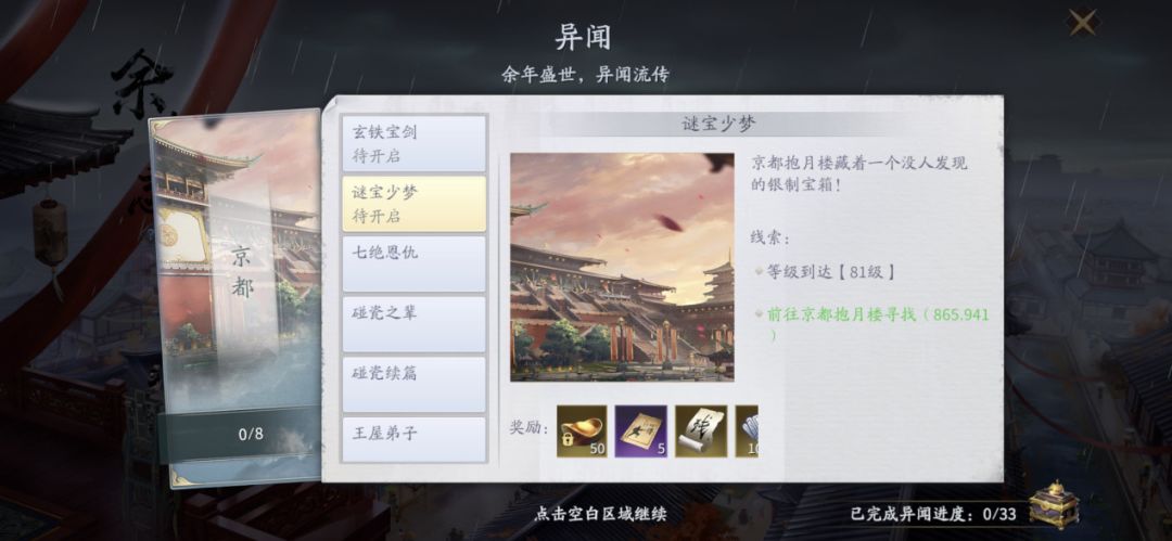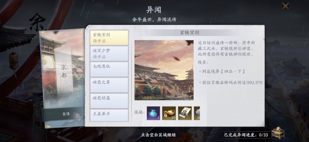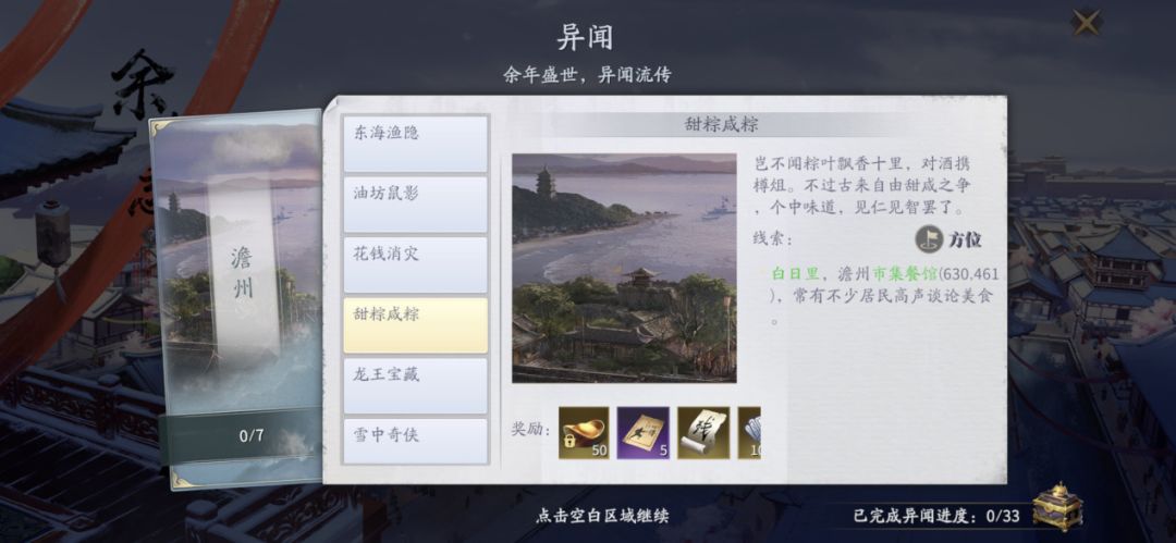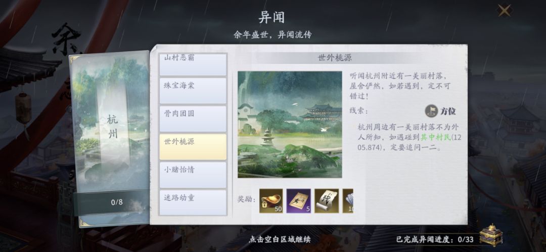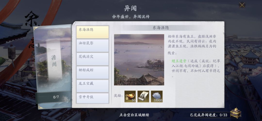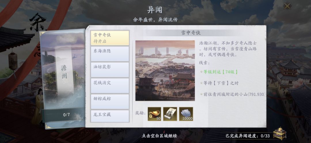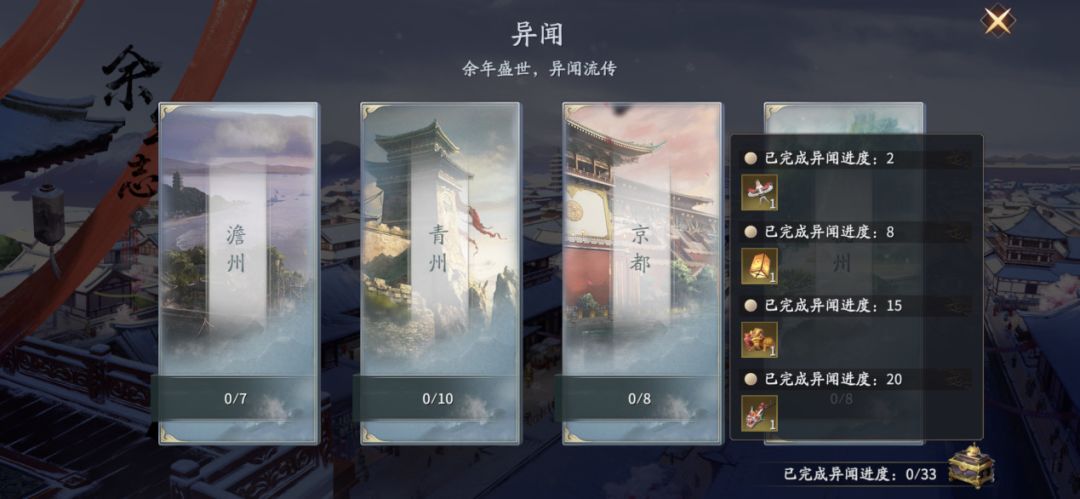 1、随着玩家的等级提升和主线剧情的完成进度系统将开启【余年志】页面,让我们点击其中第三项【异闻】进入页面,开启澹州、青州、京都、杭州的33个异闻,完成后可获得大量绑定元宝、伙伴技能书残页、提升角色等级的阅历、内功心得等等,以及达成进度后还可获得4个永久玩具。