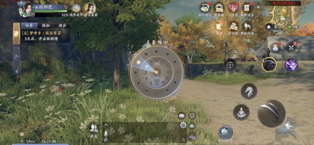 天象预测表盘的时辰,为每一格现实世界十分钟,转一圈现实世界二小时,天脉者们可以以此来计算预计等待时间;如当前表盘未出现任务所需天气,我们可以计算好时间再来,下次一定!