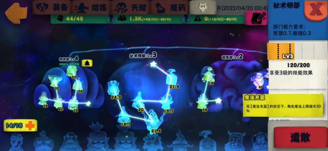训练部的使用很讲究。例如,天赋部的能力要求是工艺0.7,研究0.3,天赋点的点数=min(10/7×工艺,10/3×研究)。简单来说,对于一个5级幽灵,工艺35,研究15能让天赋点加成最大;对于一个6级幽灵来说,工艺42,研究18能让天赋点加成最大;对于一个m级幽灵来说,工艺7×m,研究3×m能让天赋点加成最大。因此,训练的时候需要计算好点数,才能确保使用最少的幽灵获得最大的天赋点加成。